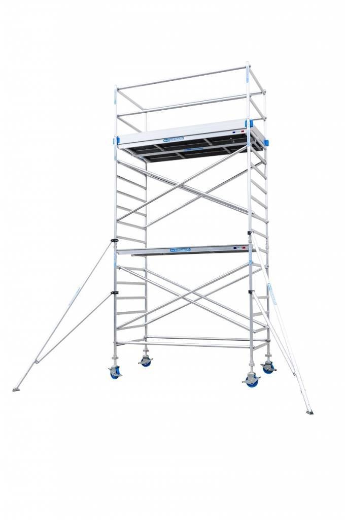 Este andamio rodante básico completo (estabilizadores incluidos) tiene una anchura de 135 cm, una longitud de 250 cm y una altura de trabajo de 6,2 metros. Este andamio es conocido por su facilidad de uso y su larga vida útil. Este andamio también es adecuado para el bricolaje y los manitas profesionales para uso en interiores y exteriores.