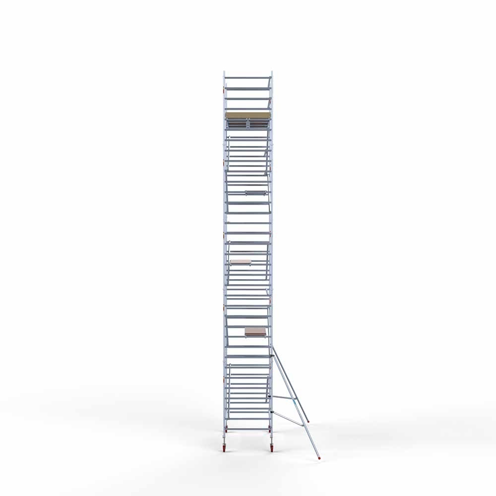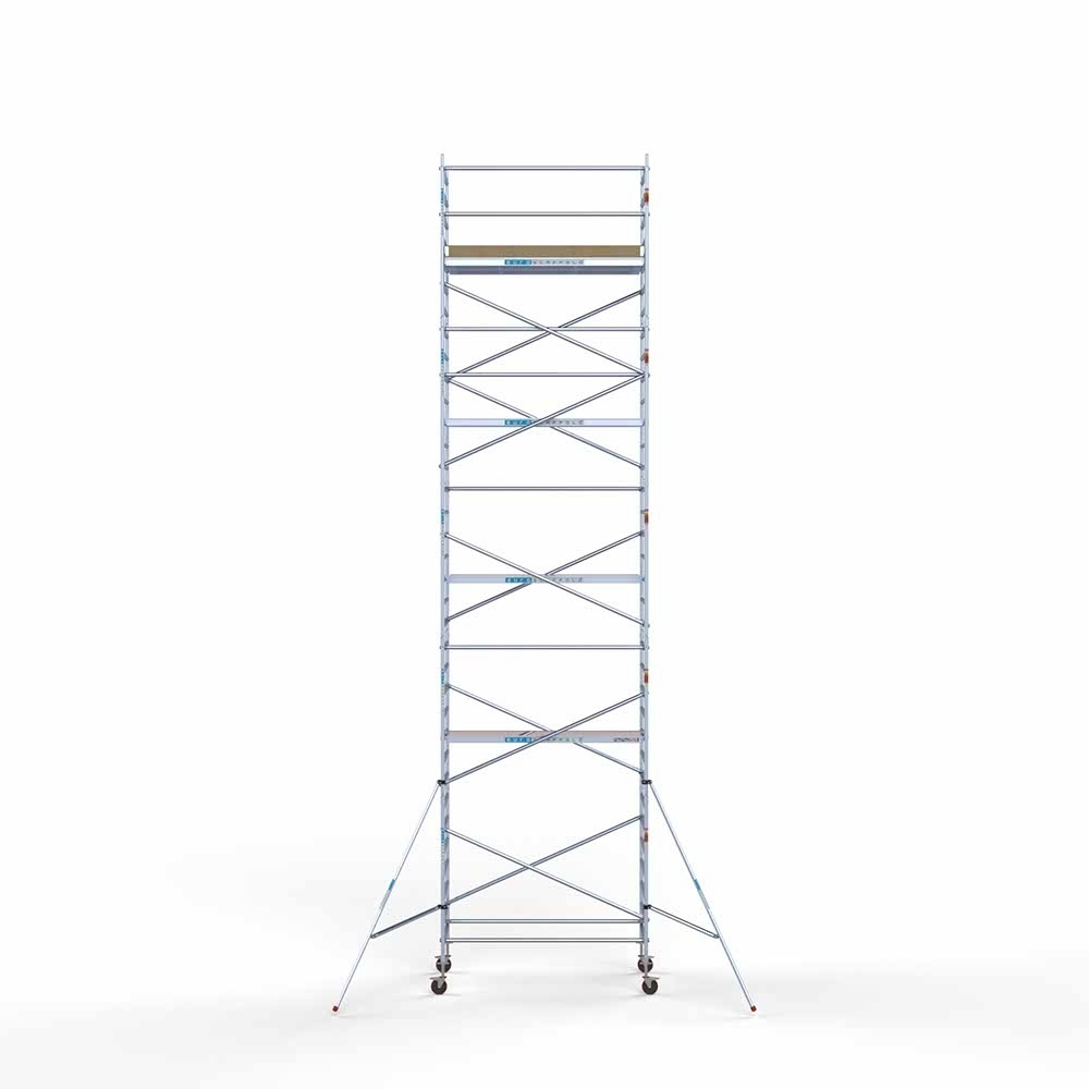 Este andamio rodante básico semiprofesional tiene una anchura de 135 cm, una longitud de 250 cm y una altura de trabajo de 11,2 metros. Esta serie de andamios tiene un equipamiento básico que los convierte en andamios para bricolaje y manitas profesionales para uso en interiores y exteriores. Proporciona un lugar estable y seguro para trabajar en altura y cumple las normas europeas. Además, el andamio rodante tiene una gran facilidad de uso gracias a los adhesivos de los largueros, que facilitan su montaje, o al material ligero de aluminio, que hace que el andamio rodante sea fácil de mover.