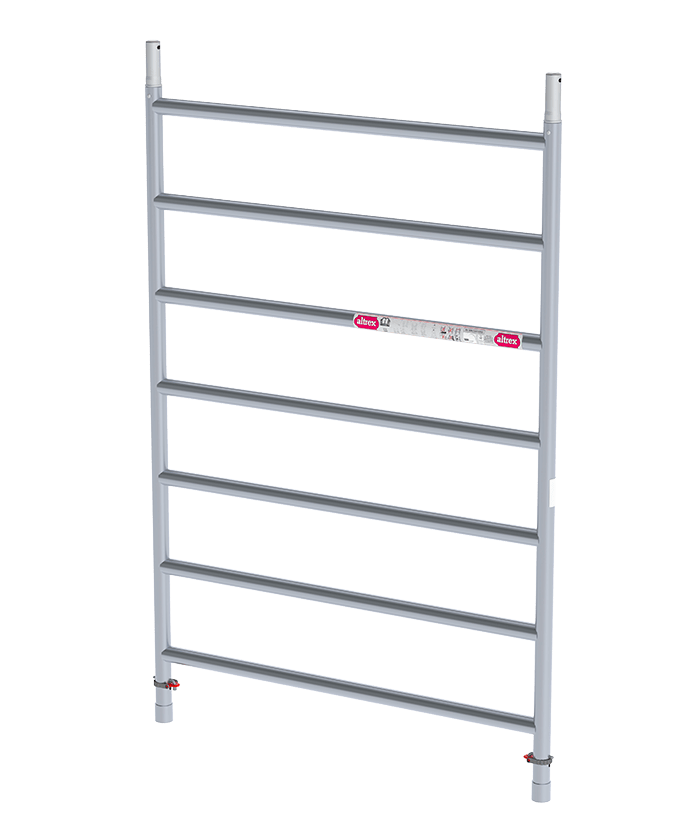 Deze professionele Altrex rolsteiger heeft een breedte van 135 cm, een lengte van 245 cm, een werkhoogte van 4,2 meter in is uitgerust met dubbele voorloopleuningen (Safe-Quick Guardrail)
